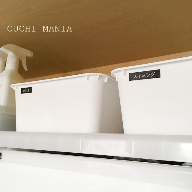 子供の習い事で使う物を、習い事別にまとめて収納しています。