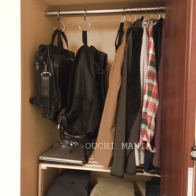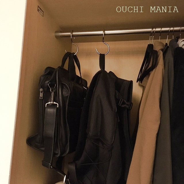 このS字フックに、カバンを吊るして収納する事にしました。