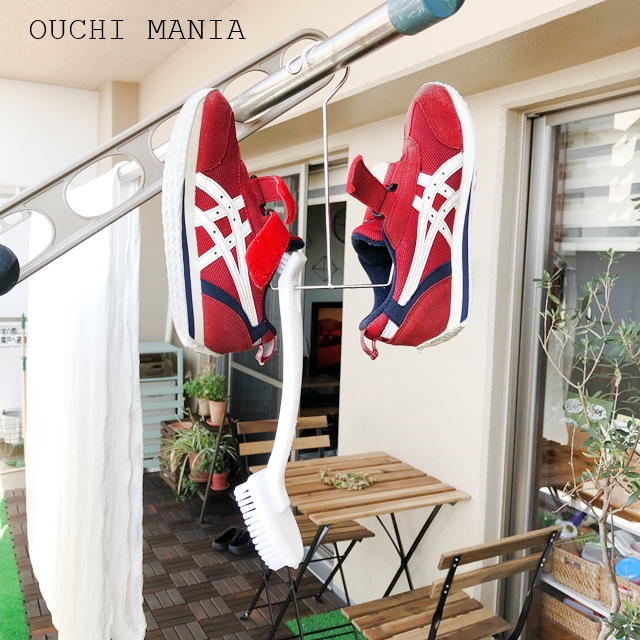 ちなみに使い終わったブラシは、同じくセリアで購入したシューズハンガーに掛けて