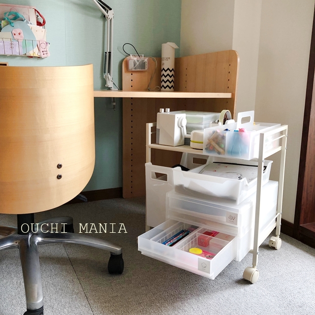 キッズスペースで、勉強机の収納として使っている、無印のポリプロピレン引き出し
