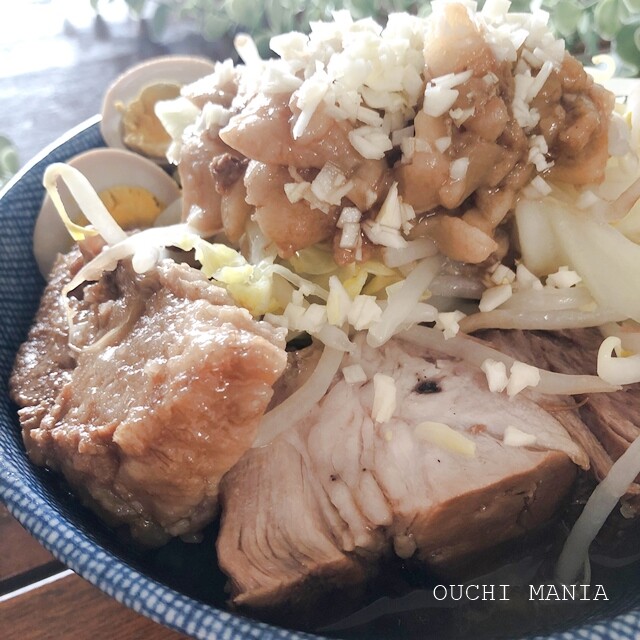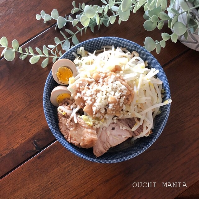 もやしや味付け脂、刻みニンニク、味玉をトッピングして完成♪