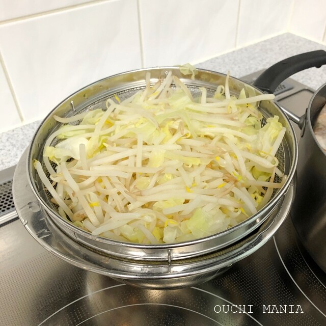 その間に大量のもやしとキャベツを茹でておきます。