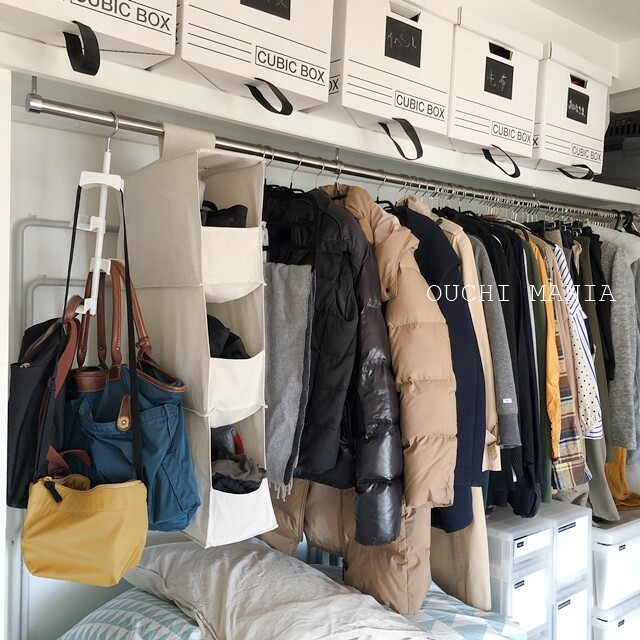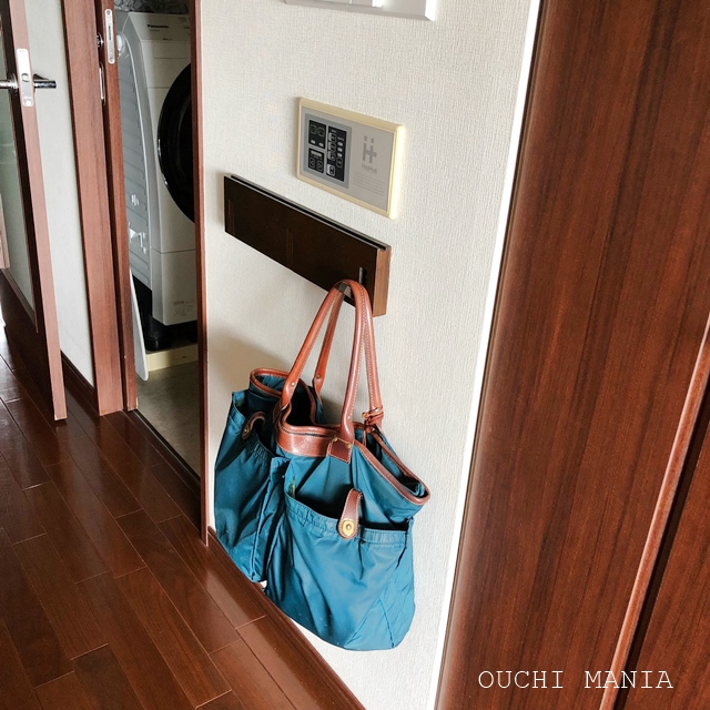 ハンガーバーにこのハンガーを掛けて、新たなカバン置き場が完成♪