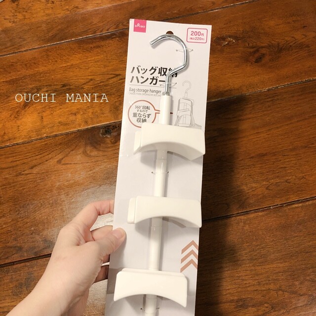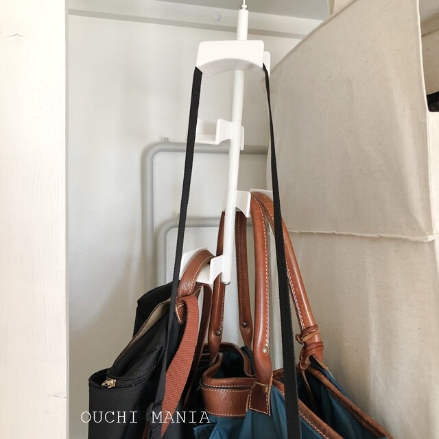カバン置き場って結構悩むのですが、ダイソーのこのハンガーを使えば、少ないスペースで複数のカバンを収納できます。