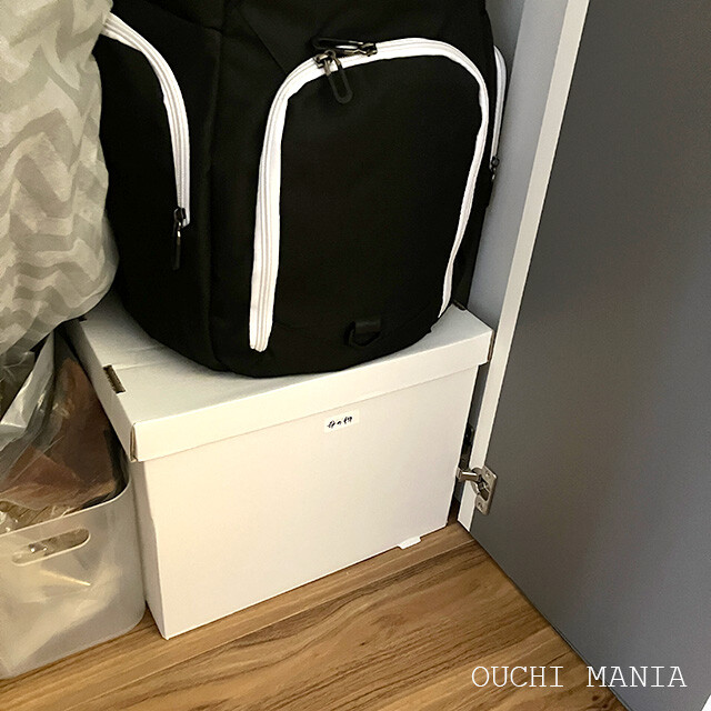 防災リュックを置いているので、その下に、箱に入れて置いています。